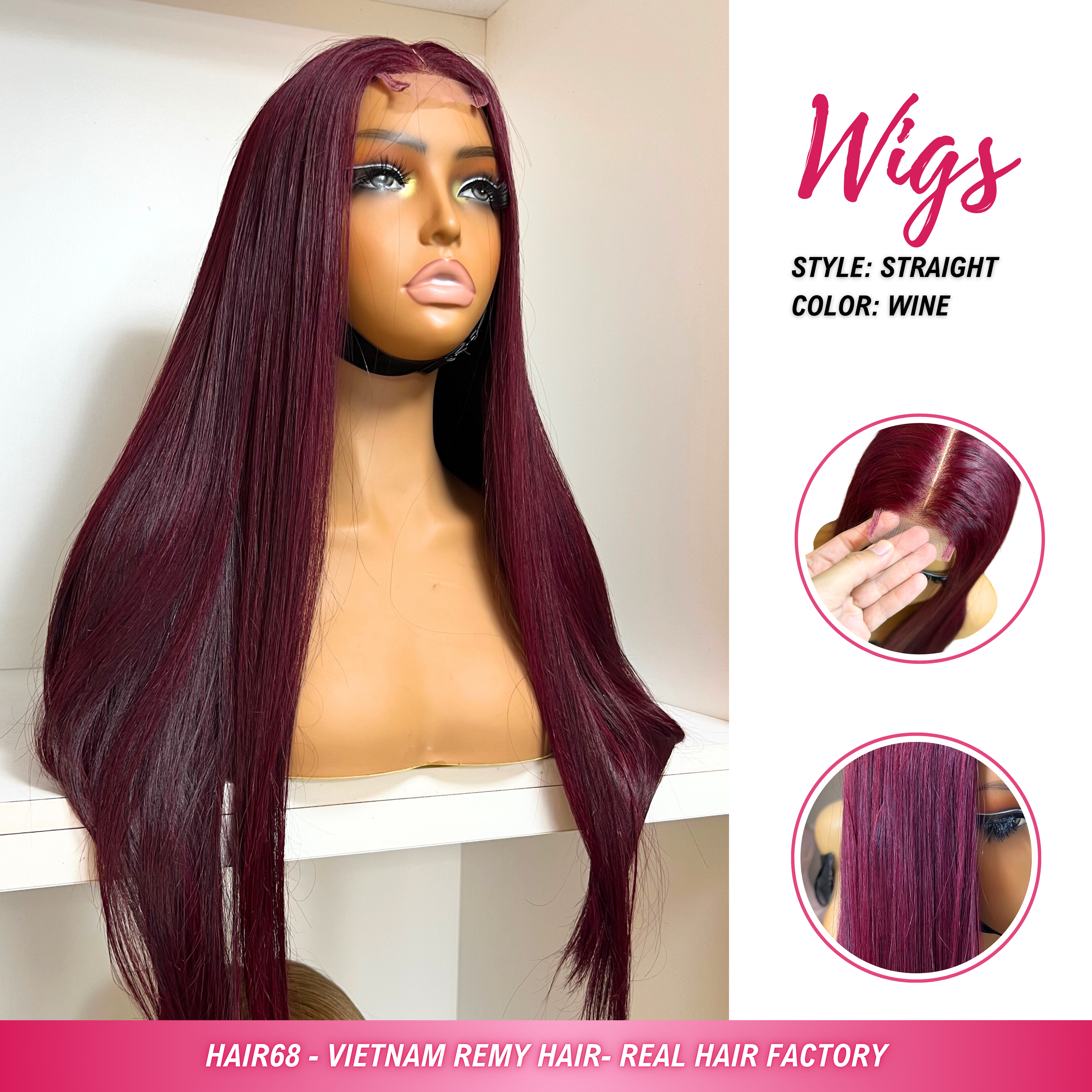 Perruque lisse couleur vin HD avec fermeture en dentelle au milieu